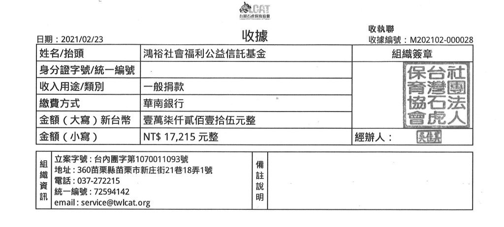 你捐血250c.c.,我捐250元給台灣石虎保育協會,做為石虎保育工作使用。